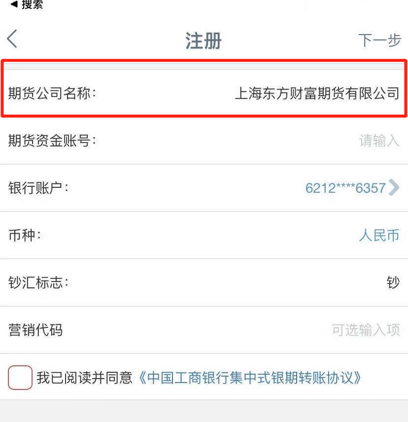 - 3选择期货公司“上海东方财富期货有限公司”,输入个人信息,营销代码可不填,阅读《中国工商银行集中式银期转账协议》后勾选;