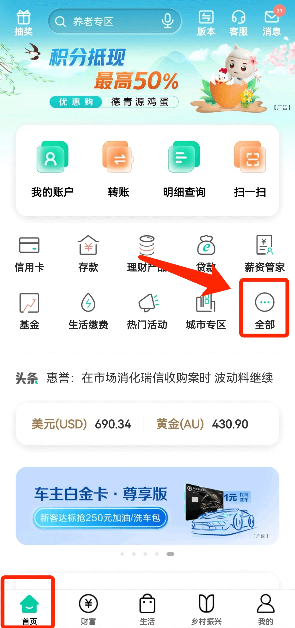 - 1下载安装农业银行手机APP,登录后在首页点击“全部”按钮;