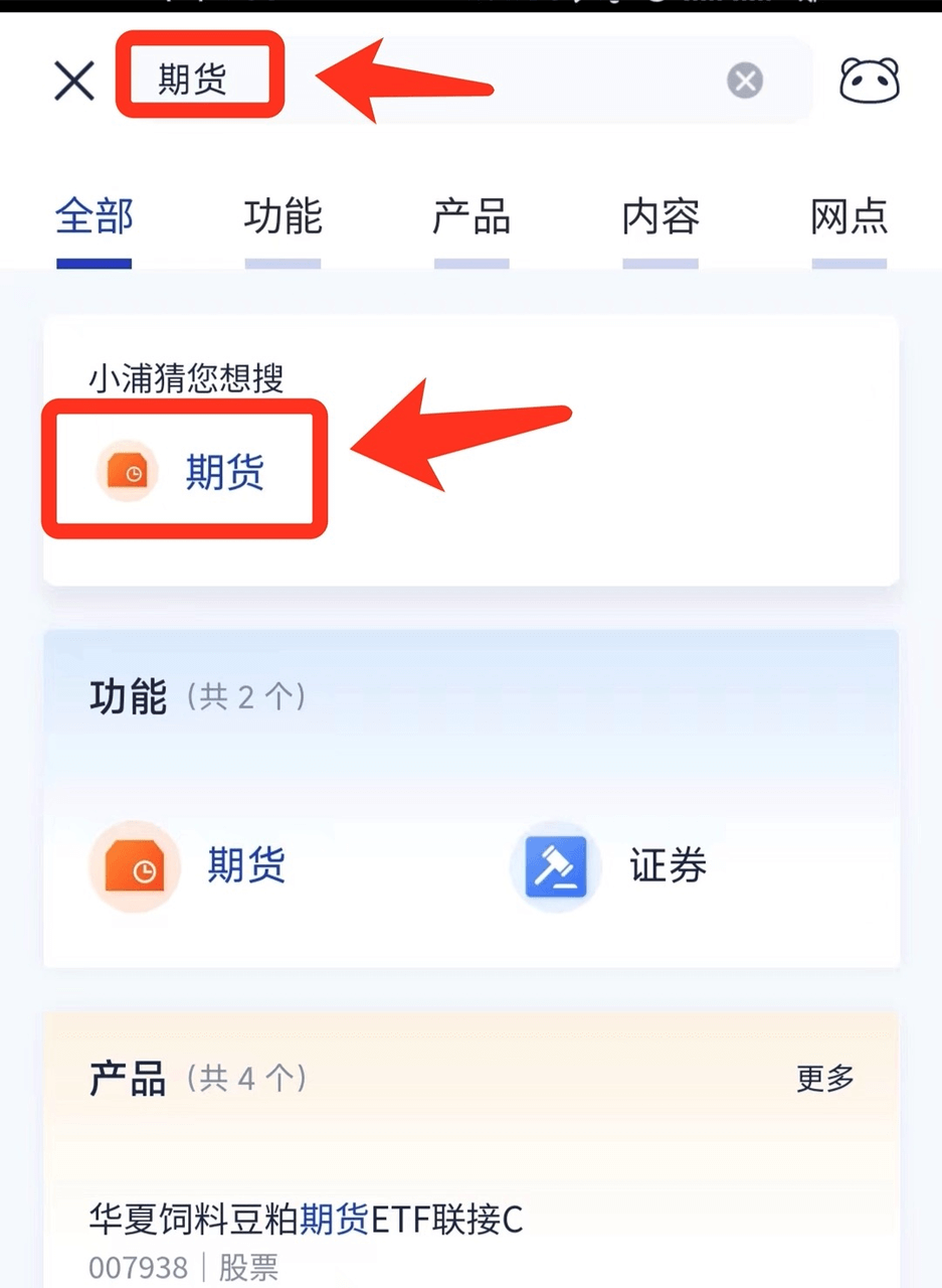 - 2在搜索框中输入“期货”二字,点击查询结果中的“期货”功能;