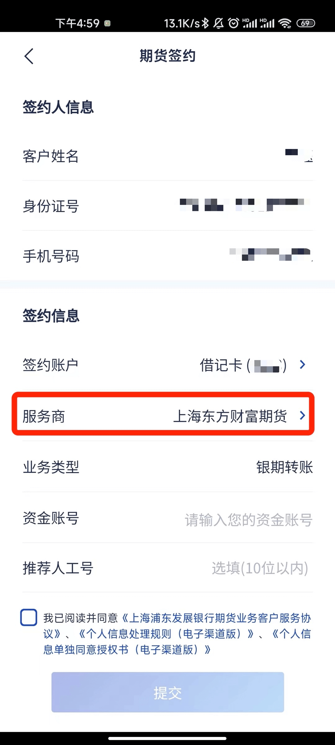 - 5填写并确认个人信息,阅读《上海浦东发展银行银期转账业务客户服务协议》后勾选,点击“提交”;