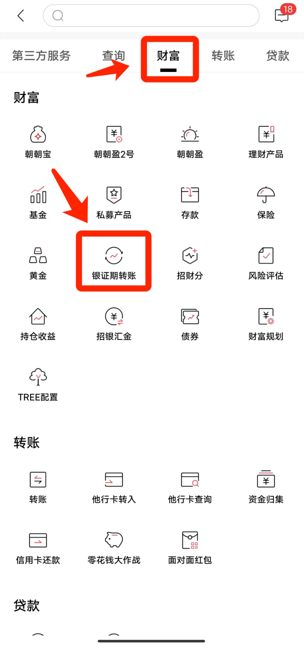 - 2选择“财富——银证期转账”;