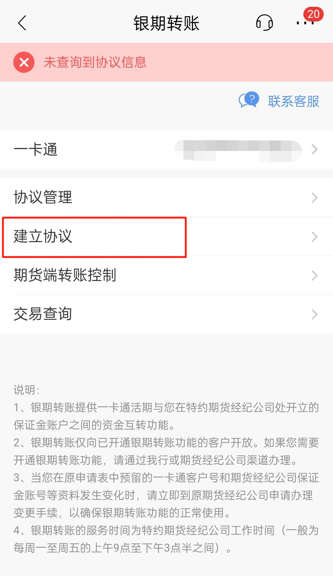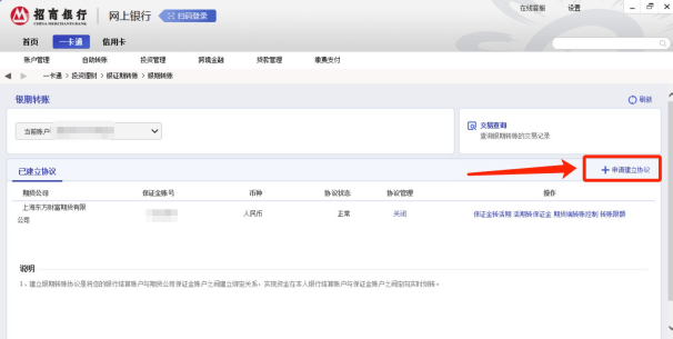 - 3在银期转账页面点击“申请建立协议”;