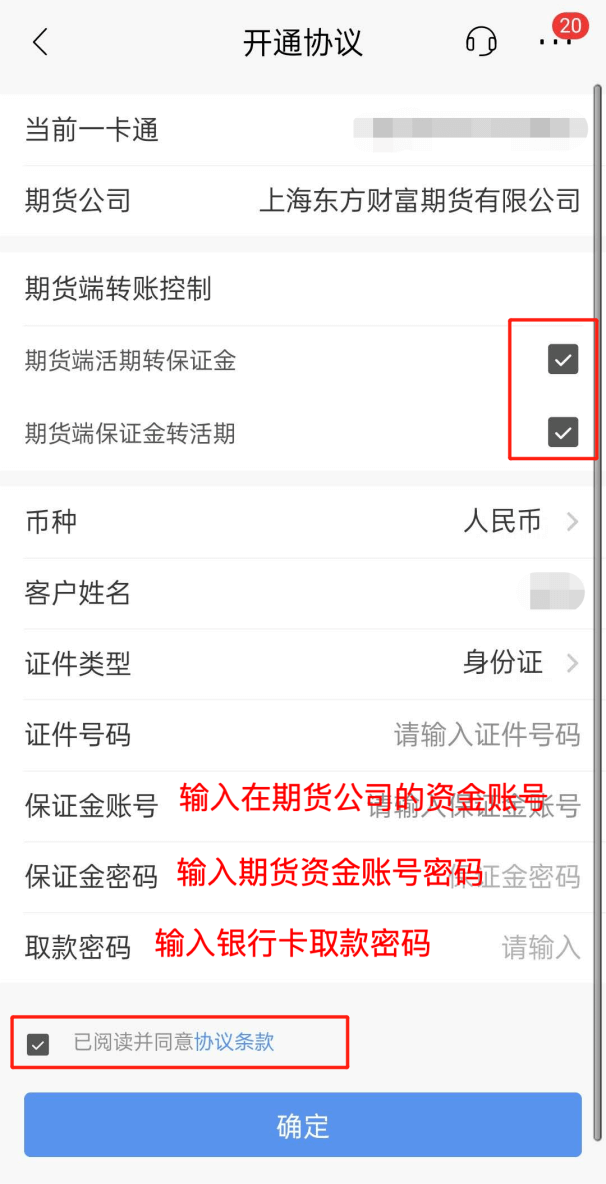 - 6勾选“期货端活期转保证金”、“期货端保证金转活期”,填写信息,阅读协议条款后勾选,点击“确定”;