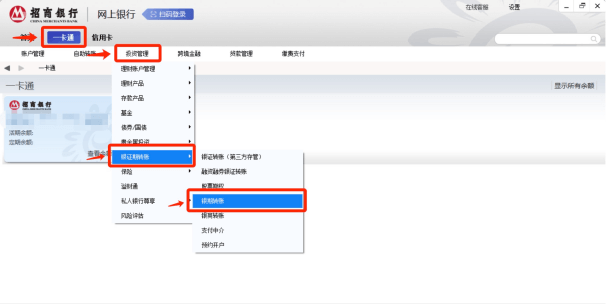 - 2打开招商银行客户端,完成登录后,在页面上方菜单栏选择“一卡通——投资管理——银证期转账——银期转账“;