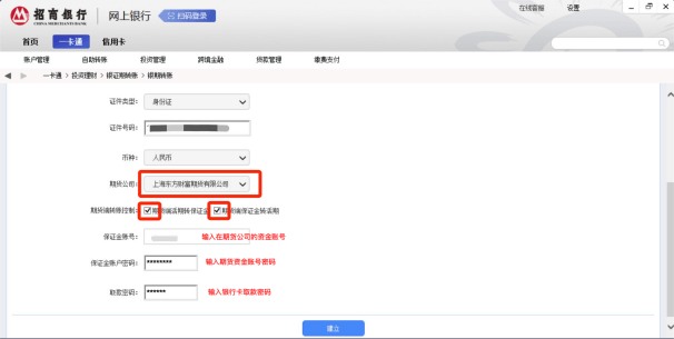 - 5填写信息,注意选择期货公司“上海东方财富期货有限公司”,勾选“期货端活期转保证金”、“期货端保证金转活期”,点击“建立”;