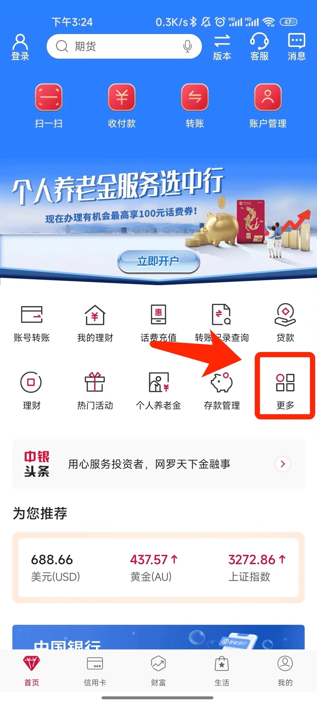 - 1下载安装中国银行APP,登录后在首页上方图标中选择“更多”;